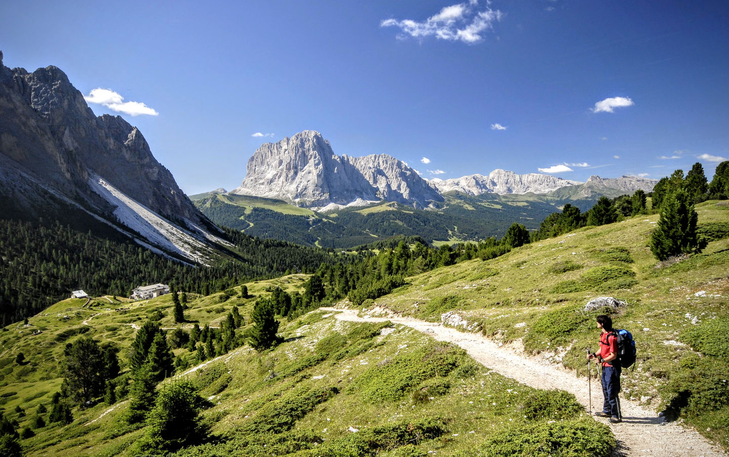 From here, now out of the woods, we take trail 13 towards the southern walls of the Odle. Behind us, Sassolungo and Sassopiatto, and around us, a "hilly" landscape dotted with boulders and fir trees. Once we reach the slopes of the Odle, we turn right, passing through an ancient landslide with boulders over 10m high (= pieces of mountain). We pass by the huts of Pieralongia and Troier (refreshment stops with postcard views) to reach Forcella Pana (2447m) and Seceda (2518m, 1.45 hours). Here, the grassy plain of the southern slope of the Odle drops almost 200 meters into the Val di Funes, offering one of the most famous views in all of the Dolomites.