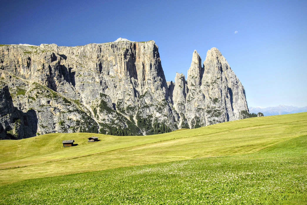 Con sentiero 10, risaliamo i pendii dell'Alpe di Siusi, con scorci fuori di testa su Sassopiatto e Sassolungo, e sullo Sciliar stesso con i suoi due caratteristici pinnacoli (Punta Santner e Punta Euringer). Fra saliscendi raggiungiamo il Saltner Hütte (m1830), ideale per fare una prima sosta.